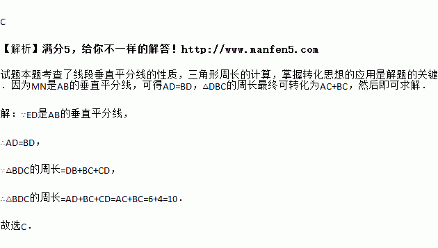 (3分)如图,△ABC中,AB=5,AC=6,BC=4,边AB的垂直平分线交AC于点D,则△BDC的周长是( )