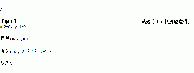 A 【解析】试题分析:根据题意得,x-2=0,y+1=0, 解得x=2,y=-1, 所以,x-y=2-(-1)=2+1=3. 故选A.