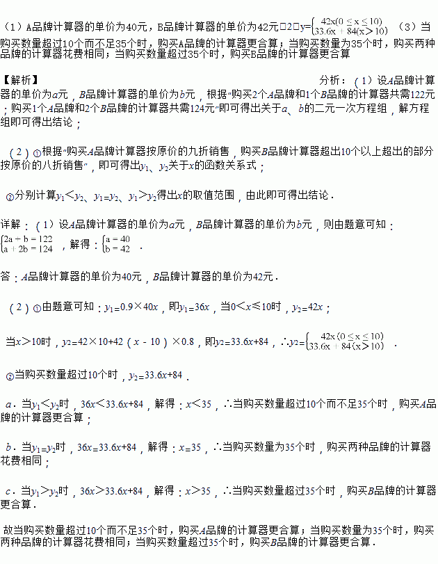 ②小明准备联系一部分同学集体购买同一品牌的计算器,若购买计算器的数量超过10个,问购买哪种品牌的计算器更合算?请说明理由.
