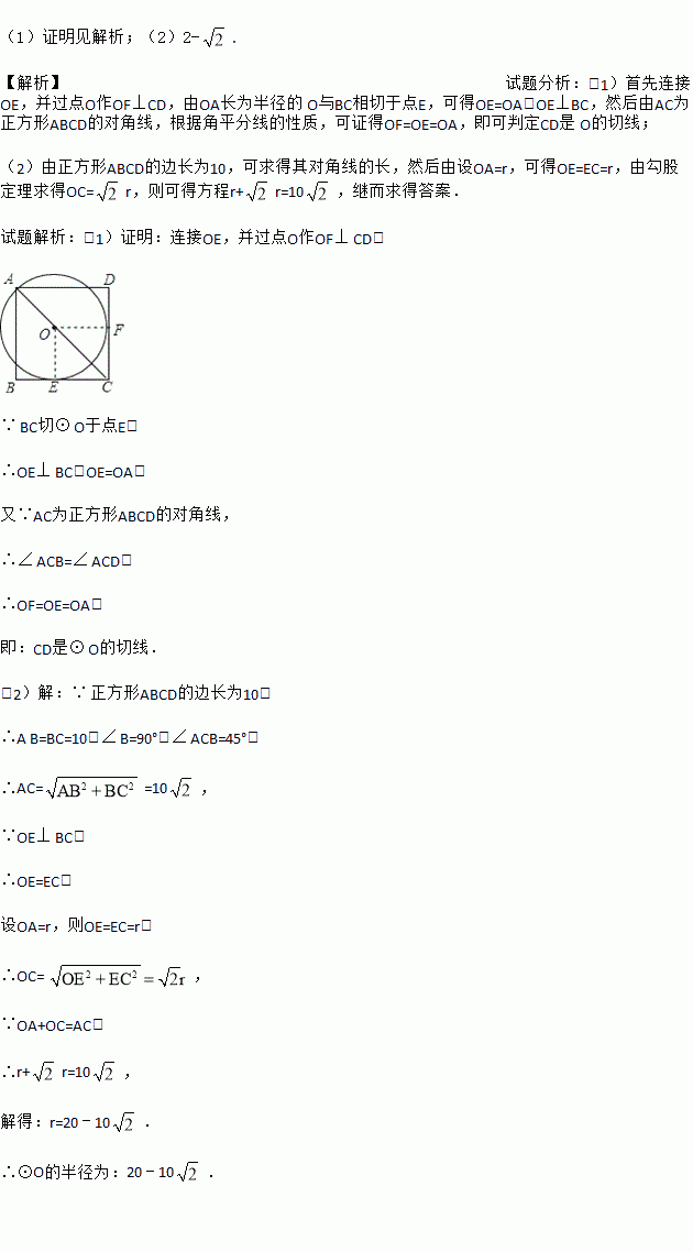 (2)若正方形ABCD的边长为1,求⊙O的半径。