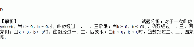 D 【解析】试题分析:对于一次函数y=kx+b,当k0,b0时,函数经过一、二、三象限;当k0,b0时,函数经过一、三、四象限;当k0,b0时,函数经过一、二、四象限;当k0,b0时,函数经过二、三、四象限.