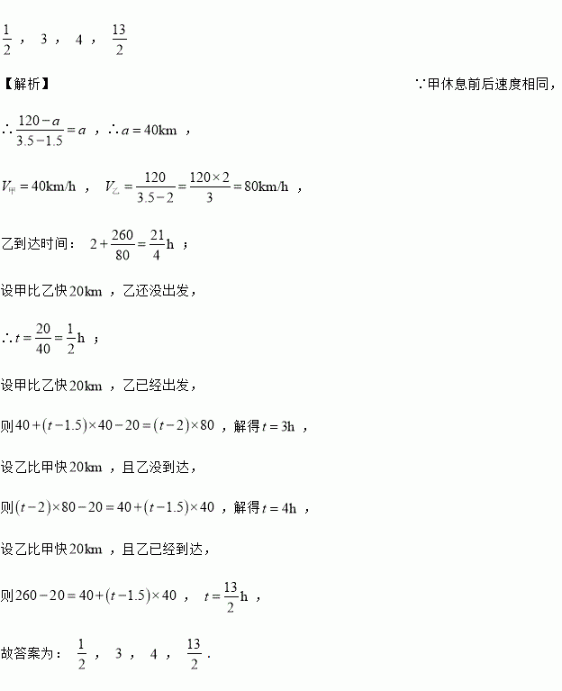 甲、乙两车从地驶向地,甲车比乙车早行驶,并且在途中休息了,休息前后速度相同,如图是甲乙两车行驶的距离与时间的函数图象,当甲车行驶__________ 时,两车恰好相距.