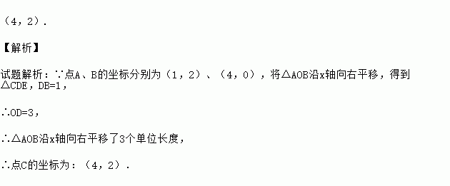 如图,点A、B的坐标分别为(1,2)、(4,0),将△AOB沿x轴向右平移,得到△CDE,已知DB=1,则点C的坐标为 .