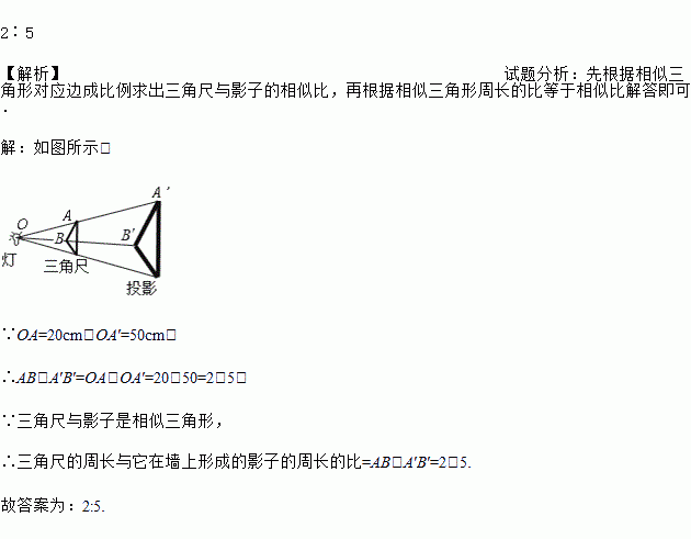 三角尺在灯泡O的照射下在墙上形成影子(如图所示).现测得OA=20cm,OA′=50cm,这个三角尺的周长与它在墙上形成的影子的周长的比是_______.