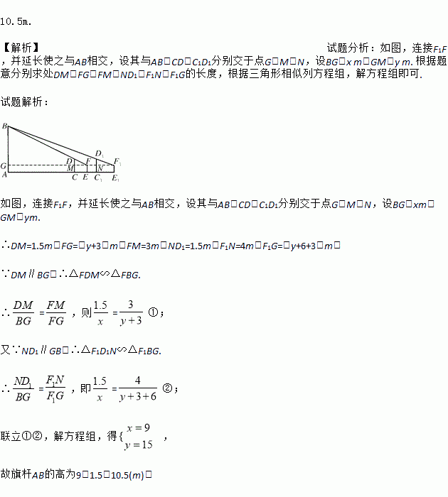 如图,学校的操场上有一旗杆AB,甲在操场上的C处竖立3 m高的竹竿CD;乙从C处退到E处恰好看到竹竿顶端D与旗杆顶端B重合,量得CE=3 m,乙的眼睛到地面的距离FE=1.5 m;丙在C1处竖立3 m高的竹竿C1D1,乙从E处后退6 m到E1处,恰好看到两根竹竿和旗杆重合,且竹竿顶端D1与旗杆顶端B也重合,量得C1E1=4 m.求旗杆AB的高.