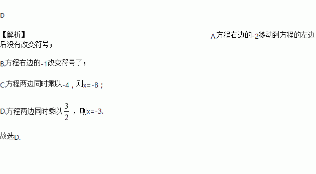 C. 由﹣x=2,得x=8 D. 由x=﹣2,得x=﹣3