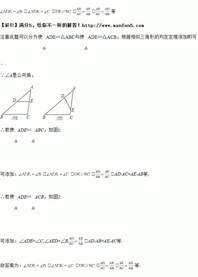 在中,点、分别在边、上,要使与相似,只须添加一个条件,这个条件可以是________(只要填写一种情况).