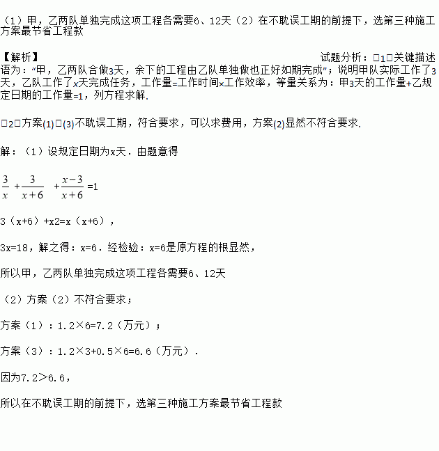 (1)甲,乙两队单独完成这项工程各需要6、12天(2)在不耽误工期的前提下,选第三种施工方案最节省工程款 【解析】试题分析:(1)关键描述语为:“甲,乙两队合做3天,余下的工程由乙队单独做也正好如期完成”;说明甲队实际工作了3天,乙队工作了x天完成任务,工作量=工作时间×工作效率,等量关系为:甲3天的工作量+乙规定日期的工作量=1,列方程求解. (2)方案(1)、(3)不耽误工期,符合...