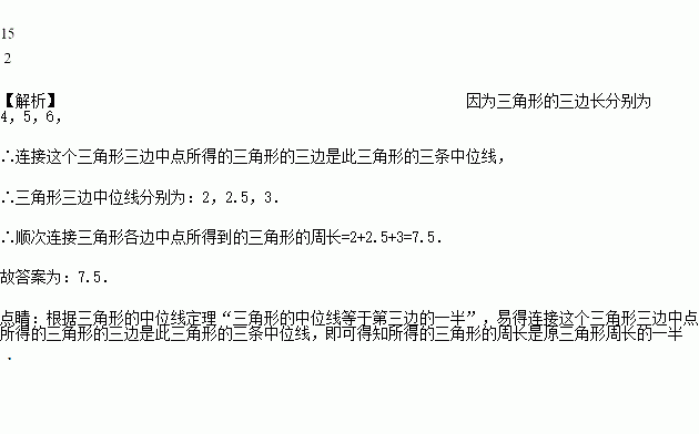 一个三角形的三边长分别为4,5,6,则连结各边中点所得三角形的周长为________________.