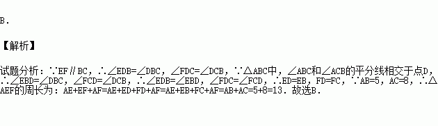 如图,△ABC中,AB=5,AC=8,BD,CD分别平分∠ABC,∠ACB,过点D作直线平行于BC,交AB,AC于E,F,则△AEF的周长为( )