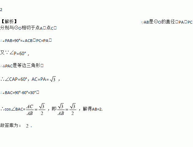 如图,AB是⊙O的直径,PA,PC分别与⊙O相切于点A,点C,若∠P60°,PA ,则AB的长为__________.