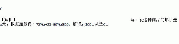C 【解析】【解析】 设这种商品的原价是x元,根据题意得:75%x+25=90%x﹣20,解得x=300.故选C.