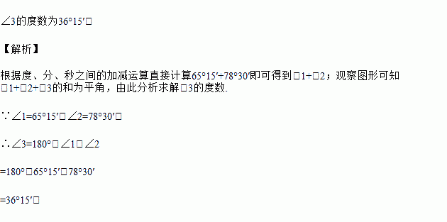 如图,AB是一条直线,如果∠1=65°15′,∠2=78°30′,求∠3的度数.