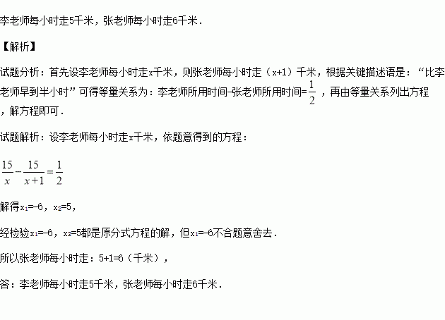张老师和李老师同时从学校出发,步行15千米去县城购买书籍,张老师比李老师每小时多走1千米,结果比李老师早到半小时,两位老师每小时各走多少千米?