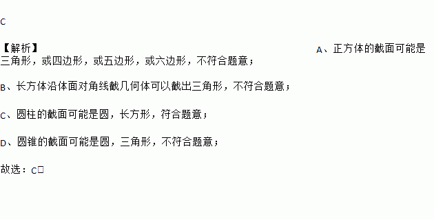 C 【解析】A、正方体的截面可能是三角形,或四边形,或五边形,或六边形,不符合题意; B、长方体沿体面对角线截几何体可以截出三角形,不符合题意; C、圆柱的截面可能是圆,长方形,符合题意; D、圆锥的截面可能是圆,三角形,不符合题意; 故选:C.