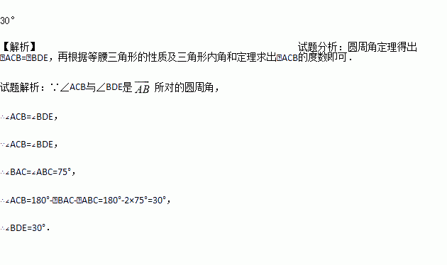 如图,AD为⊙O的直径,∠ABC=75º,且AC=BC,则∠BDE=_________.