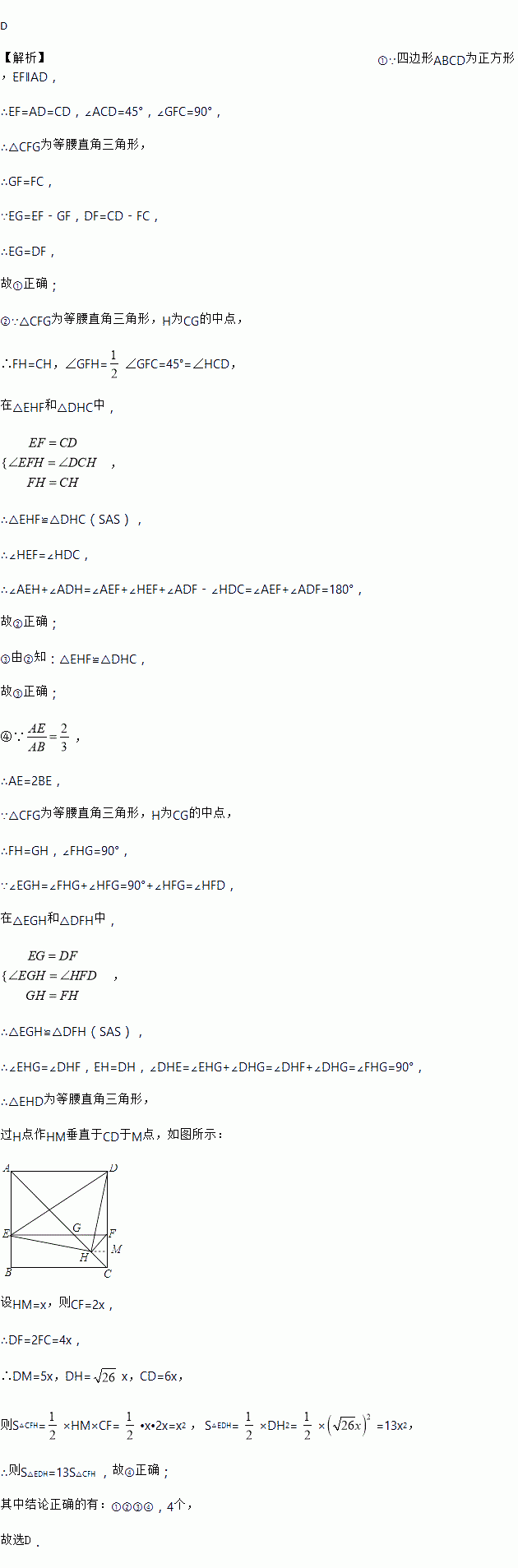 如图,在正方形ABCD中,AC为对角线,E为AB上一点,过点E作EF∥AD,与AC,DC分别交于点G,F,H为CG的中点,连接DE,EH,DH,FH.下列结论中结论正确的有( )