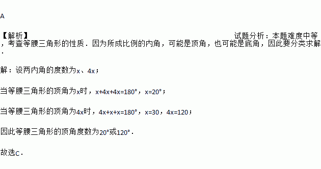 A 【解析】试题分析:本题难度中等,考查等腰三角形的性质.因为所成比例的内角,可能是顶角,也可能是底角,因此要分类求解. 【解析】 设两内角的度数为x、4x; 当等腰三角形的顶角为x时,x+4x+4x=180°,x=20°; 当等腰三角形的顶角为4x时,4x+x+x=180°,x=30,4x=120; 因此等腰三角形的顶角度数为20°或120°. 故选C.