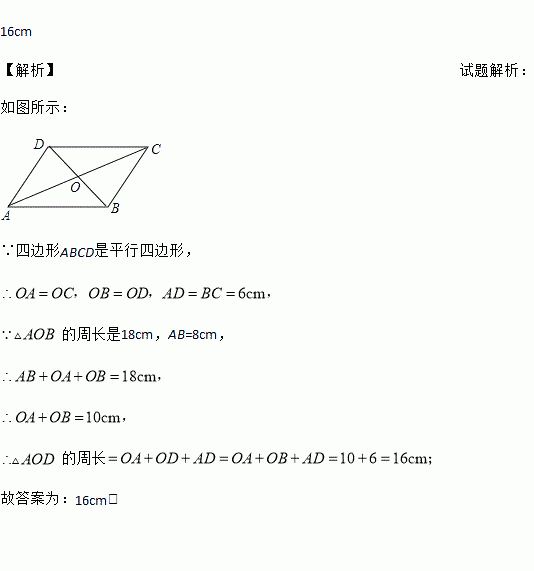 在□ABCD中,对角线AC,BD相交于点O,AB=8cm,BC=6cm.△AOB的周长是18cm,则△AOD的周长是__________.