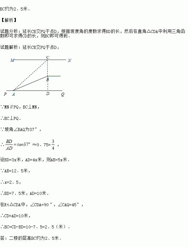 如图1,某超市从底楼到二楼有一自动扶梯,图2是侧面示意图.已知自动扶梯AB的长度是12.5米,MN是二楼楼顶,MN∥PQ,C是MN上处在自动扶梯顶端B点正上方的一点,BC⊥MN,在自动扶梯底端A处测得C点的仰角∠CAQ为45°,坡角∠BAQ为37°,求二楼的层高BC(精确到0.1米).(参考数据:sin37°≈0.60,cos37°≈0.80,tan37°≈0.75 )