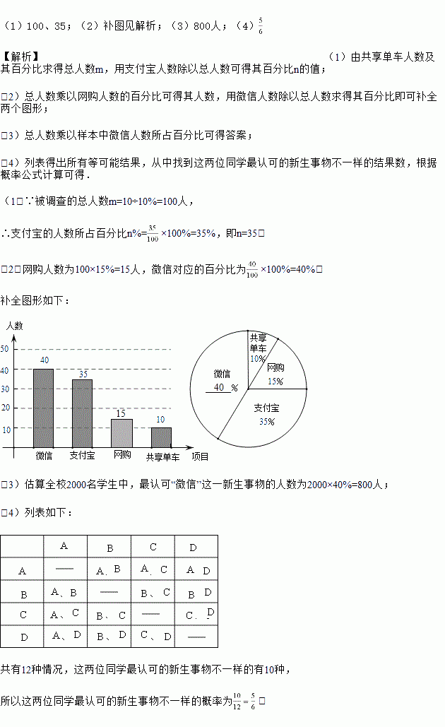 (4)已知A、B两位同学都最认可“微信”,C同学最认可“支付宝”D同学最认可“网购”从这四名同学中抽取两名同学,请你通过树状图或表格,求出这两位同学最认可的新生事物不一样的概率.