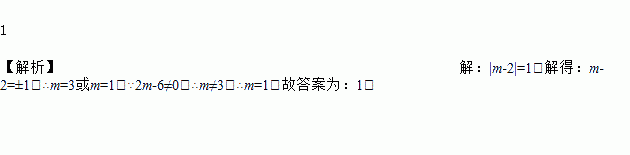 1 【解析】【解析】 |m-2|=1,解得:m-2=±1,∴m=3或m=1,∵2m-6≠0,∴m≠3,∴m=1.故答案为:1.