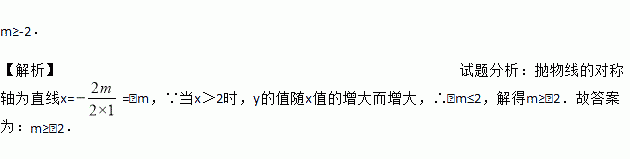 m≥-2. 【解析】试题分析:抛物线的对称轴为直线x==﹣m,∵当x>2时,y的值随x值的增大而增大,∴﹣m≤2,解得m≥﹣2.故答案为:m≥﹣2.