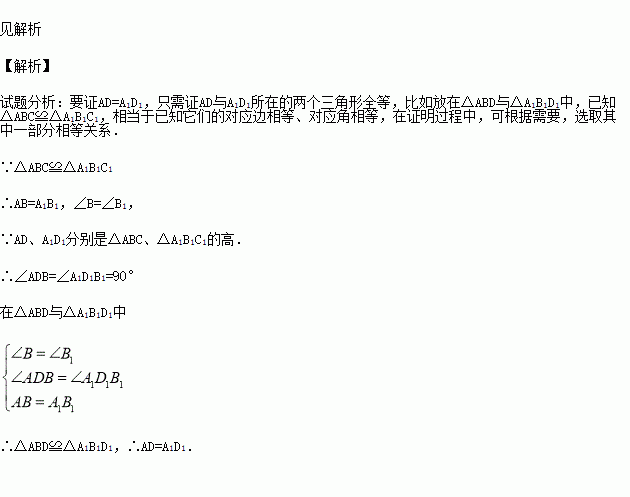 如图,△ABC≌△A1B1C1,AD、A1D1分别是△ABC和△A1B1C1的高.试说明:AD=A1D1.