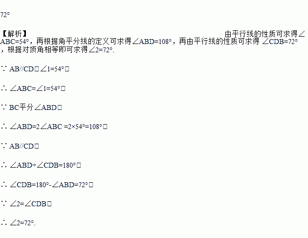 如图,直线AB//CD,BC平分∠ABD,∠1=54°,求∠2的度数.
