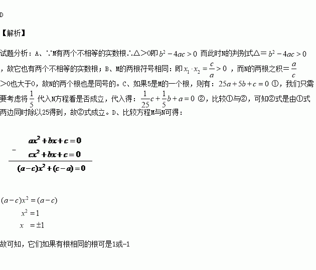 B、如果方程M有两根符号相同,那么方程N的两根符号也相同;