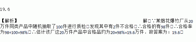 某服装厂从20万件同类产品中随机抽取了100件进行质检,发现其中有2件不合格,那么你估计该厂这20万件产品中合格品约为________ 万件.