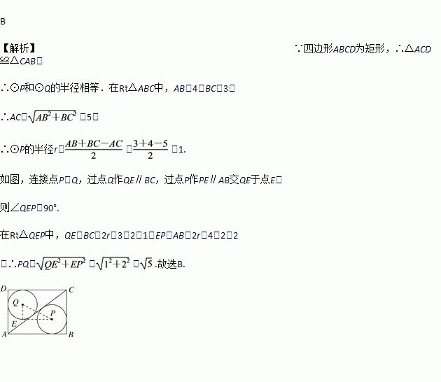如图,矩形ABCD中,AB=4,BC=3,连接AC,⊙P和⊙Q分别是△ABC和△ADC的内切圆,则PQ的长是 ( )