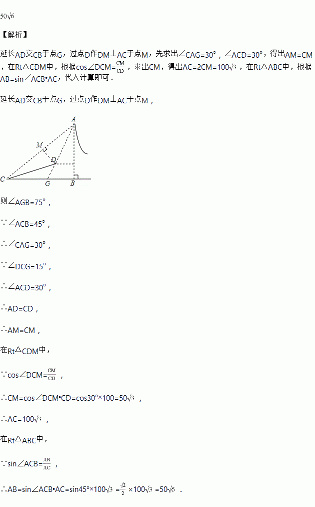 如图,为了测量山的高度,先在山脚的一点测得山顶的仰角为,再沿坡角为的山坡走米到点,又测得山顶的仰角是,则山高________.(带根号)