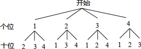 8.现有四张分别写有数字1,2,3,4的卡片,它们除数字外完全相同,把卡片背面朝上洗匀,从中随机抽取一张不放回,再从中随机抽取另一张,若把第一张卡片上的数字作为个位数字,第二张卡片上的数字作为十位数字,组成一个两位数,则这个两位数是3的整数倍的概率是$\frac{1}{3}$.分析 首先根据题意画出树状图,然后由树状图求得所有等可能的结果与这个两位数是3的整数倍的情况,再利用概率公式即可求得答案.