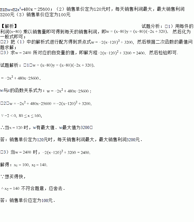 新春佳节,电子鞭炮因其安全、无污染开始走俏.某商店经销一种电子鞭炮,已知这种电子鞭炮的成本价为每盒80元,市场调查发现,该种电子鞭炮每天的销售量y(盒)与销售单价x(元)有如下关系:y=﹣2x+320(80≤x≤160).设这种电子鞭炮每天的销售利润为w元.