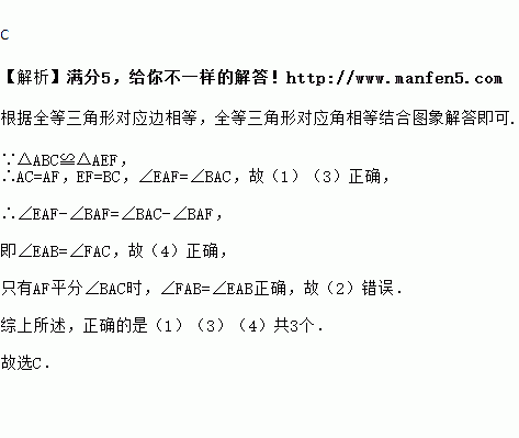 如图所示,△ABC ≌△AEF,AB=AE,∠B=∠E,有以下结论:①AC=AF;②∠FAB=∠EAB;③EF=BC;④∠EAB=∠FAC,其中正确的个数是 ( )