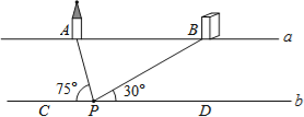 如图,河流两岸a、b互相平行,点A、B是河岸a上的两座建筑物,点C、D是河岸b上的两点,A、B的距离约为200米.某人在河岸b上的点P处测得∠APC=75°,∠BPD=30°,则河流的宽度约为 米.