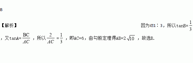 如图,梯形护坝的斜坡 AB 的坡度 i =1∶3,坝高 BC 为2米,则斜坡 AB 的长是( )