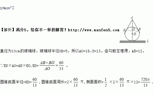 用一直径为10cm的玻璃球和一个圆锥形的牛皮纸纸帽可以制成一个不倒翁玩具,不倒翁的轴剖面图如图所示,圆锥的母线AB与⊙O相切于点B,不倒翁的顶点A到桌面L的最大距离是18cm.若将圆锥形纸帽的表面全涂上颜色,则需要涂色部分的面积约为 cm2(精确到1cm2).