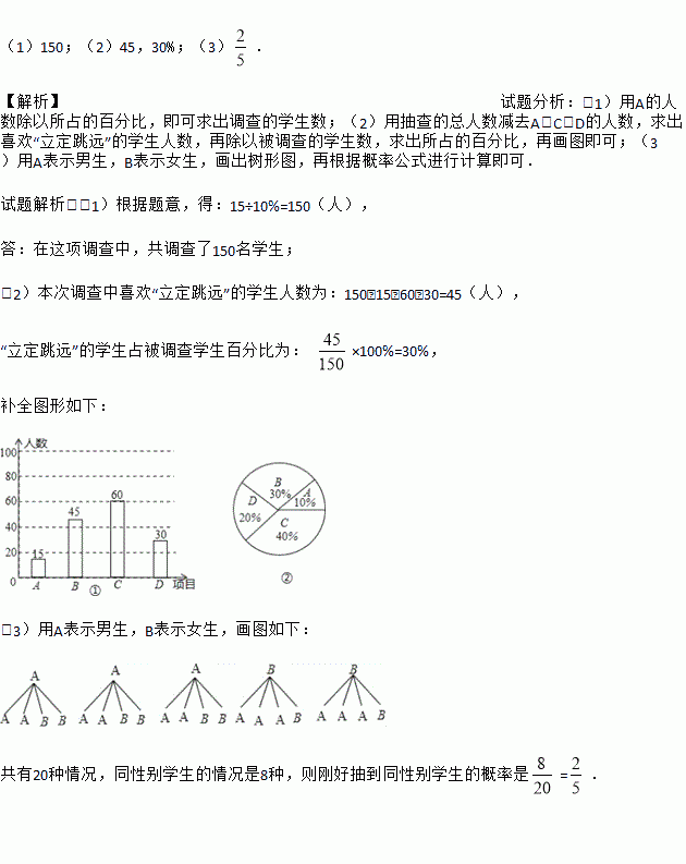 £¨3£©Èôµ÷²éµ½Ï²»¶¡°ÌøÉþ¡±µÄ5ÃûѧÉúÖÐÓÐ3ÃûÄÐÉú£¬2ÃûÅ®Éú£®ÏÖ´ÓÕâ5ÃûѧÉúÖÐÈÎÒâ³éÈ¡2ÃûѧÉú£®ÇëÓûÊ÷״ͼ»òÁбíµÄ·½·¨£¬Çó³ö¸ÕºÃ³éµ½Í¬ÐÔ±ðѧÉúµÄ¸ÅÂÊ£®
