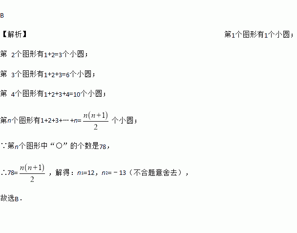 将一些相同的“○”按如图所示摆放,观察每个图形中的“○”的个数,若第n个图形中“○”的个数是78,则n的值是( )