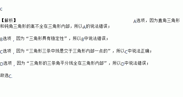 C 【解析】A选项,因为直角三角形和钝角三角形的高不全在三角形内部,所以A的说法错误; B选项,因为“三角形具有稳定性”,所以B中说法错误; C选项,因为“三角形三条中线是交于三角形内部一点的”,所以C中说法正确; D选项,因为“三角形的三条角平分线全在三角形内部”,所以D中说法错误; 故选C.