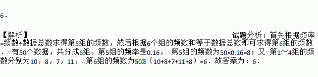 6. 【解析】试题分析:首先根据频率=频数÷数据总数求得第5组的频数,然后根据6个组的频数和等于数据总数即可求得第6组的频数.∵有50个数据,共分成6组,第5组的频率是0.16,∴第5组的频数为50×0.16=8;又∵第1~4组的频数分别为10,8,7,11,∴第6组的频数为50﹣(10+8+7+11+8)=6.故答案为:6.