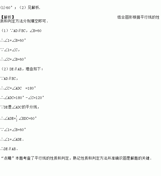 如图,AD∥BC,∠1=∠C,∠B=60°.