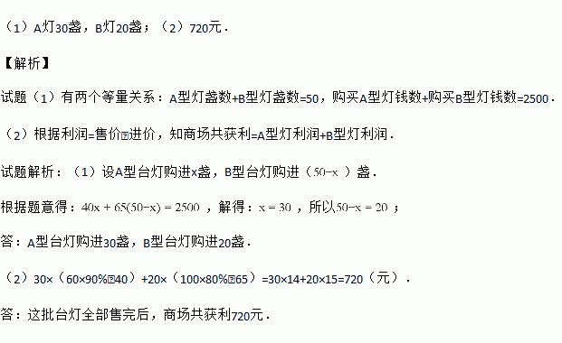 (2)若A型台灯按标价的9折出售,B型台灯按标价的8折出售,则这批台灯全部售出后,商场共获利多少元?