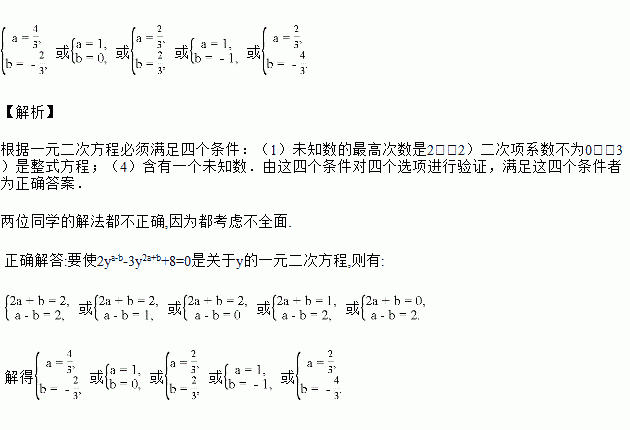 一天,老师在黑板上布置了这样一道题目:如果2ya-b-3y2a+b+8=0是关于y的一元二次方程,你能试着求出a,b的值吗?