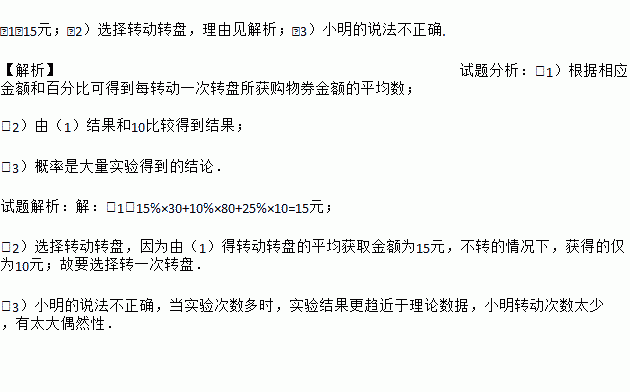 (1)每转动一次转盘所获购物券金额的平均数是多少?