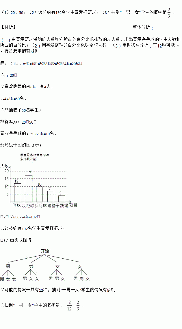 (3)学校准备从喜欢跳绳活动的4人(二男二女)中随机选取2人进行体能测试,求抽到一男一女学生的概率是多少?