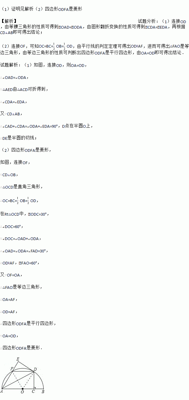 如图,AB是半圆O的直径,点C为半径OB上一点,过点C作CD丄AB交半圆O于点D,将△ACD沿AD折叠得到△AED,AE交半圆于点F,连接DF.