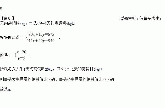 B 【解析】试题解析:设每头大牛1天约需饲料xkg,每头小牛1天约需饲料ykg, 根据题意得: , 解得: , 所以每头大牛1天约需饲料20kg,每头小牛1天约需饲料5kg, 则每头大牛需要的饲料估计正确,每头小牛需要的饲料估计不正确 故选B.